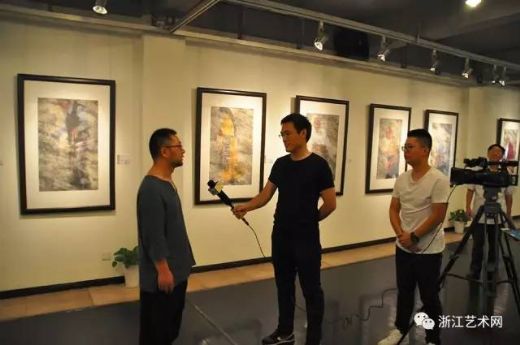 (从左到右)民盟浙江省委原秘书长汪传凯、金华市政协副主席胡锦全、中国美术学院艺术管理与教育学院院长黄骏、参展艺术家王伟成、民盟浙江省委秘书长何志芬